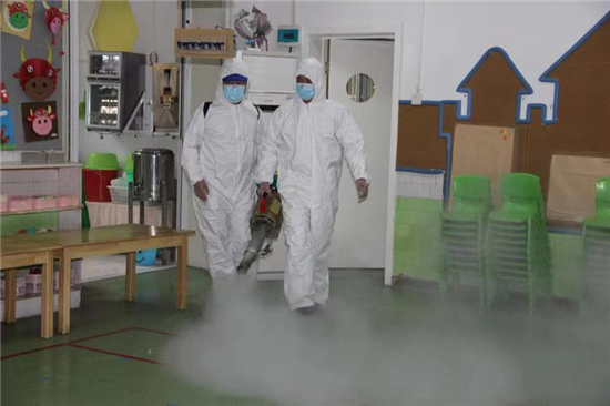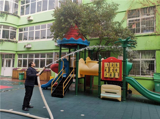 2月27日下午, 周口市市直幼兒園聯(lián)系周口市藍天救援隊專業(yè)消殺人員,對幼兒園的公共區(qū)域環(huán)境、大型玩具、走廊、活動室等場所逐步實施消殺,重點對樓道、樓梯扶手、衛(wèi)生間等關(guān)鍵區(qū)域?qū)嵤┟芗?,做到全面、徹底、不留死角?/p>