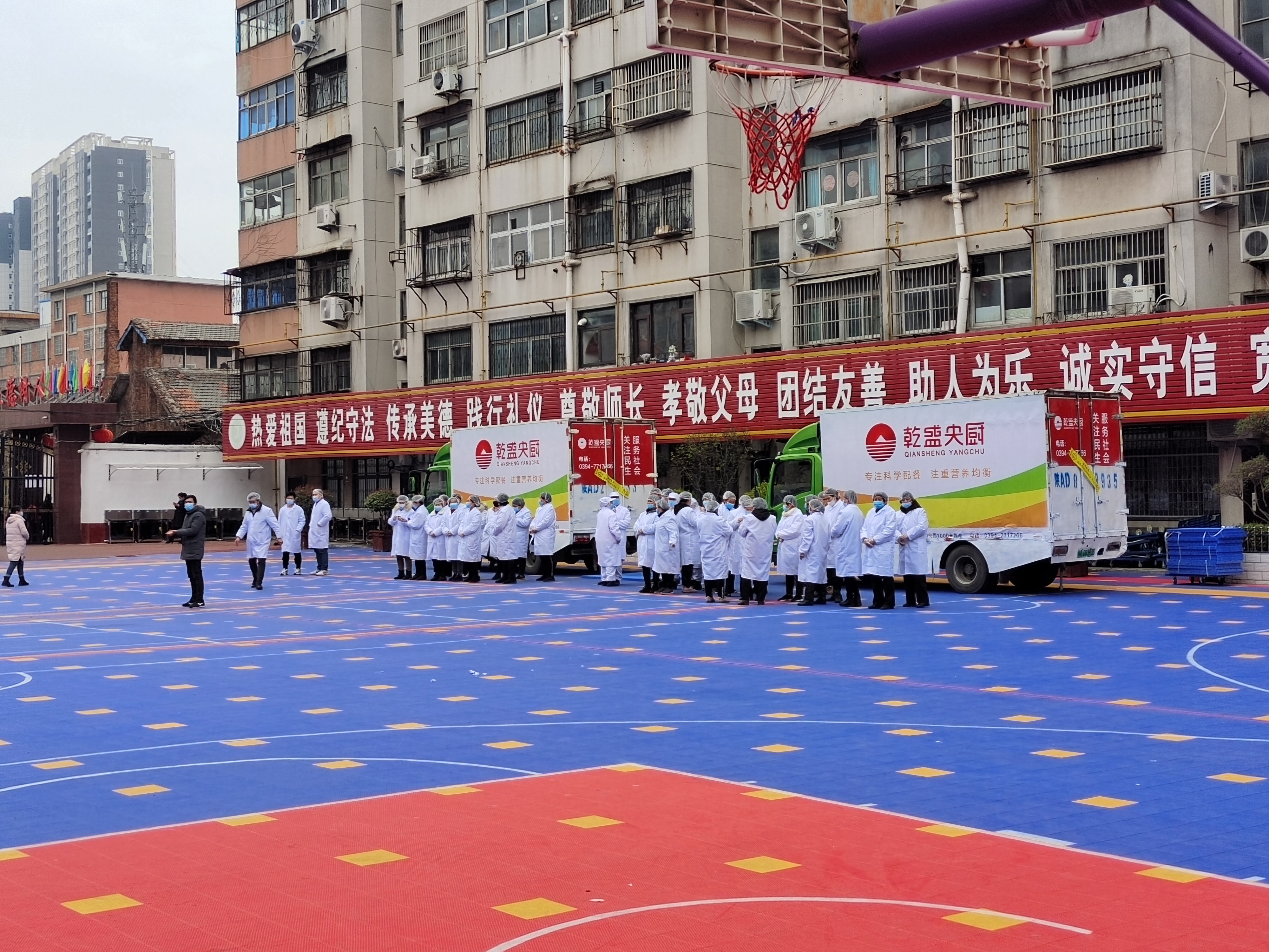 11時許,13000余份熱騰騰的飯菜即將送到周口市中心城區(qū)中小學生手中,直播團隊對七一路二小的配送情況進行現(xiàn)場直播。兩輛運餐大卡車,20余名工作人員整裝待發(fā),乾盛央廚鄭州總公司的營銷部負責人現(xiàn)場指揮調度七一路二小的發(fā)餐工作。揭掉卡車上的封條,留樣,測溫,裝車,按班分送,分發(fā)不銹鋼餐具,“哇!獅子頭??!”在孩子們的驚呼聲中,兩葷一素,一份米一份湯,熱氣騰騰地盛到孩子手中的餐具中?!昂⒆觽兂圆怀缘娘栄??”面對各直播平臺上網(wǎng)友的提問,乾盛央廚鄭州總公司營銷部負責人回答:“我們提前有準備,飯、菜我們都免費加,保證孩子們都吃飽,請家長朋友們放心?!?/p>