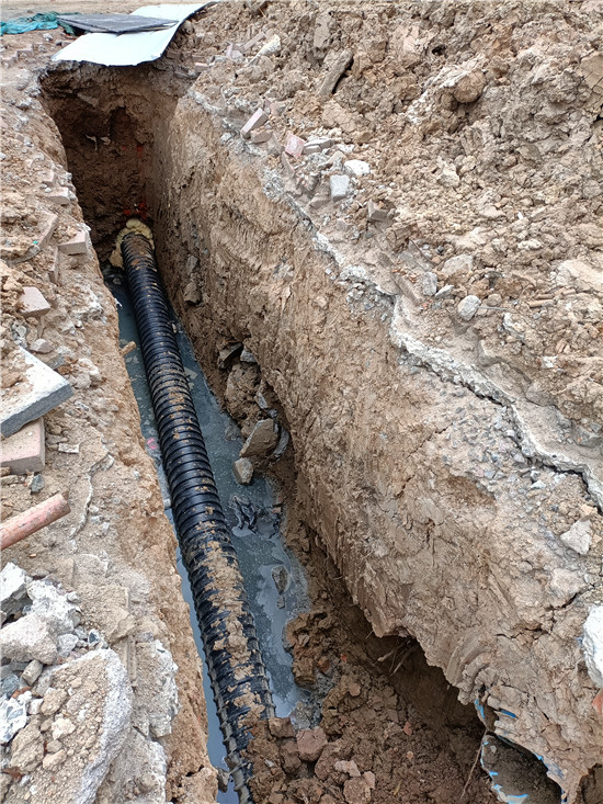 居住在維也納小區(qū)的幾位居民分析說,維也納大門前邊的污水有可能是對面施工堵塞下水道后造成污水溢出造成的。記者又來到維也納小區(qū)對面的馨蓮茗苑小區(qū)門前,那里路面沒有積水,正在進(jìn)行的市政工程施工工地也沒有看到有大量污水流淌,在馨蓮茗苑大門東邊不遠(yuǎn)處有一條挖開的管道溝槽,溝槽的底部有少量污水。剛下班的一名工人師傅說,現(xiàn)在他們正在修建新的下水道,管道建好還得一段時間,舊的排水管道還在使用,至于路南邊的污水與正在施工的工程有沒有聯(lián)系,他們也說不清楚。