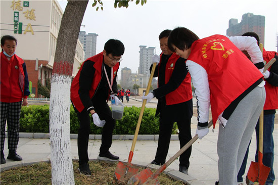 另一邊,黨員教師則手拿滾刷,給校門口公園北路兩側(cè)的法桐樹刷上白灰、紅漆,宛若給樹穿了件新衣。伴隨著他們忙碌的身影,一排排法桐樹煥然一新,整齊的“紅白裙子”看上去格外漂亮。