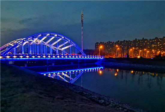 夜幕降臨時,流沙河泰山路橋溫馨的燈光亮了起來,夢幻藍(lán)、蘋果綠、水晶紫、多種顏色變換的橋體顯得熠熠生輝 ,多彩的橋在水面的映襯下流光溢彩。
