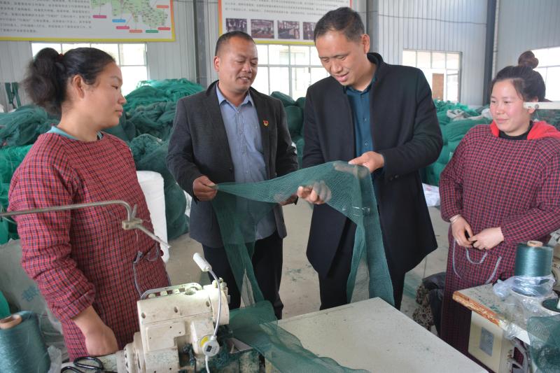 3月27日,商水縣平店鄉(xiāng)李崗村“商水縣龍巢網(wǎng)業(yè)公司”經(jīng)理羅國(guó)昌向村黨支部書記李金棋(左二)介紹漁網(wǎng)編織產(chǎn)業(yè)產(chǎn)銷帶貧情況。羅國(guó)昌和妻子劉清華2009年創(chuàng)辦漁網(wǎng)編織加工廠、2017年擴(kuò)建新區(qū),現(xiàn)有3個(gè)大型生產(chǎn)車間庫(kù)房,發(fā)展30多個(gè)分廠、40多個(gè)聯(lián)系點(diǎn),年產(chǎn)各種成品漁網(wǎng)500萬(wàn)條,產(chǎn)品銷往國(guó)內(nèi)江蘇、安微、山東、河北、湖北等10多個(gè)省區(qū)和30多個(gè)沿??h市水產(chǎn)公司,部分出口到俄羅斯及東南亞地區(qū),年創(chuàng)產(chǎn)值約1.6億元,精準(zhǔn)幫扶225戶群眾脫貧,帶貧群眾有1萬(wàn)余人。