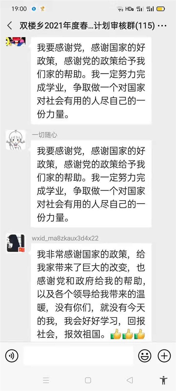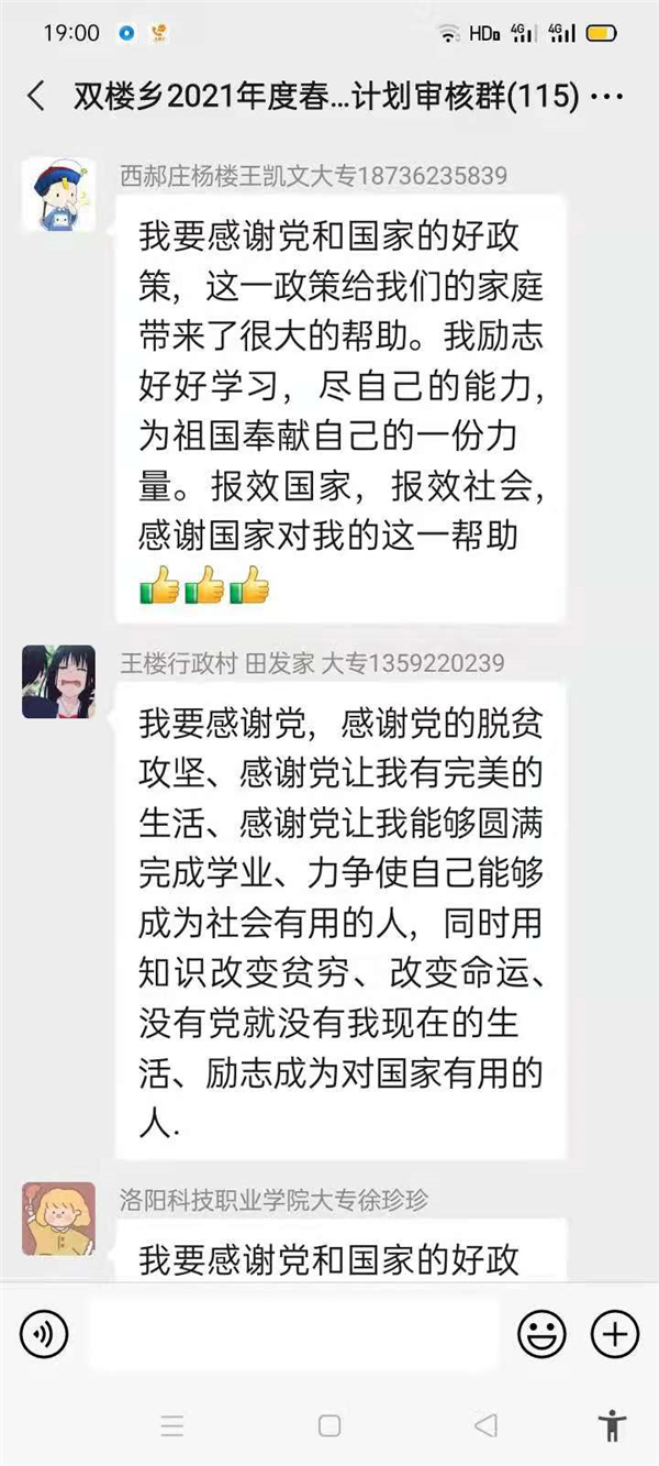 “感謝幫助過我家的所有幫扶人,沒有你們,就沒有我家今天的幸福生活,我們光榮脫貧了,作為貧困家庭中新成長勞動力,我一定珍惜這次來之不易的學(xué)習(xí)機會,好好學(xué)習(xí)技術(shù),畢業(yè)后回村成為一名技術(shù)帶頭人,來促進家鄉(xiāng)產(chǎn)業(yè)的發(fā)展?!编惓强h雙樓鄉(xiāng)孫莊村脫貧學(xué)生張素華在微信群里說。近幾天,鄲城縣雙樓鄉(xiāng)114人的大學(xué)生微信群里可熱鬧了,在鄉(xiāng)黨委政府的引導(dǎo)下,該鄉(xiāng)眾多脫貧后的大學(xué)生通過鄉(xiāng)里建起的微信群,紛紛圍繞“話脫貧、感黨恩、奮進新時代”這一主題交流思想,提振斗志。