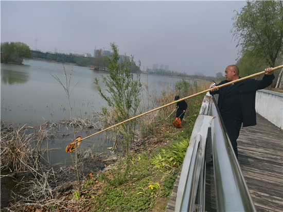 4月16日,周口植物園管理人員及保潔人員在打撈漂浮在湖水中的垃圾及枯草。為了給市民提供一個干凈、優(yōu)美的園內(nèi)環(huán)境,植物園的工作人員每天都會清理打撈湖水中的雜物。