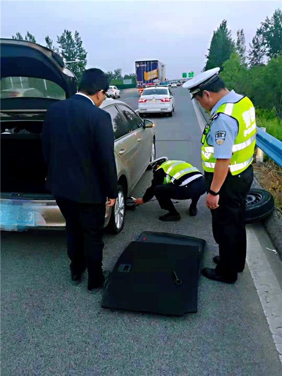 該男子看到民警過來,當即求助,說自己在車輛行駛過程中,發(fā)現(xiàn)右側后輪爆胎,自己沒有處理這種狀況的經(jīng)驗,不會更換輪胎,車上就他一人,感到非常無助。當時,途經(jīng)車輛呼嘯而過,天色逐漸暗了下來,情況十分危險??吹酱朔N情況,巡邏民警立即動手從車上拿來工具,迅速幫該車主把破損輪胎卸掉,更換上車載備胎,解決了司機的燃眉之急,并告知其盡快從最近出口離開,更換標準輪胎后才能在高速公路上安全行駛。該司機再三表示感謝后駕車離去。③6
