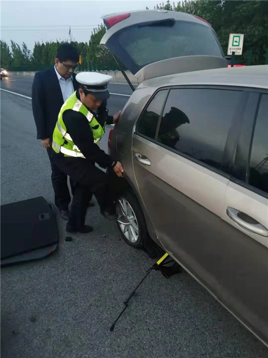 5月2日19時許,市公安局交通管理支隊高速二大隊項城中隊(以下簡稱高速二大隊項城中隊)民警由北往南方向巡邏途中,行駛到2081公里附近西半幅處,發(fā)現(xiàn)一輛轎車因車后輪爆胎,被迫停在應急車道,民警隨即幫助該車主更換車載備胎,解決了司機的燃眉之急。