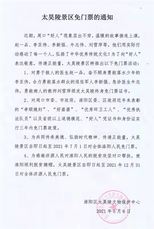 同時(shí),為共同傳承美德、弘揚(yáng)時(shí)代精神、傳遞正能量,太昊陵景區(qū)自即日起至2021年7月1日對(duì)全體洛陽人民免門票;為感謝濟(jì)源人民對(duì)淮陽人民的脫貧攻堅(jiān)對(duì)口幫扶,使淮陽順利脫貧摘帽,太昊陵景區(qū)自5月6日起至2021年12月31日對(duì)全體濟(jì)源人民免門票。②7