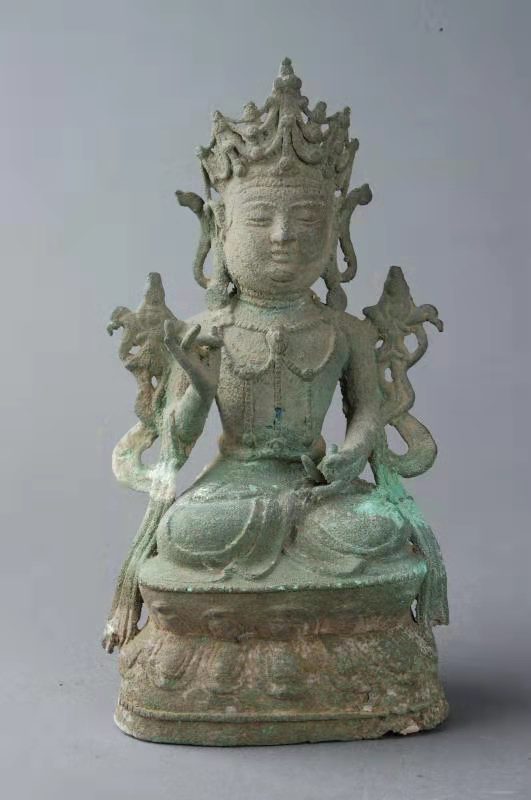 商水壽圣寺塔,高41.5米,為九級樓閣式磚塔。塔體從底至頂漸收勻稱,平面呈正六邊形。塔頂用鑄鐵鑄成葫蘆形寶頂,給人以挺拔雋秀之感。塔的層檐收放尺寸設(shè)計精妙,既保護了塔墻免遭雨雪侵蝕,又使塔體顯得莊重肅穆。塔身諸層外壁皆辟有圓券門、破子欞假窗,塔身各角砌出倚柱,檐下密布磚雕斗拱。塔內(nèi)砌出塔心室和盤旋梯道,可逐層登高至塔頂。塔第一層,南面辟門,門楣上刻“明道二年癸酉歲三月一日丙寅時戊寅日,葬舍利院主。僧□□建□□功德塔”。說明建塔的年代是北宋。塔室為穹窿頂。東南、西南兩壁有破子欞盲窗各1個,西壁另辟一拱券門,有踏道可登至第二層塔心室。第二層,南面辟門,東南、西南兩壁各砌一盲窗,東壁另辟一門可沿踏道進入第三層。以上諸層大同小異。第四層,塔心室內(nèi)北墻嵌石雕佛像3尊,兩尊盤膝正面像,一尊盤膝背面像。剎柱下端插入塔心室,上端置鐵質(zhì)寶瓶,在不同部位還發(fā)現(xiàn)“風(fēng)調(diào)雨順”“國泰民安”“周王千歲千千歲”“大明嘉靖二十八年九月吉日”“河南周府施舍西華小瑤集壽圣寺塔一座”等字樣,這些都說明了明代嘉靖年間,又重修了塔身。1998年9月,在維修該塔時,在天宮清理出明代銅佛像3尊,白釉瓷盤1只,白釉黑花瓷碗、白釉褐花瓷碗各1個,刻印大彌陀經(jīng)1卷。銅佛像高約20厘米,其中一尊有“嘉靖三十一年”字樣,這一時期的周王為周敬王朱在鋌,這說明嘉靖三十一年周敬王朱在鋌為祈福曾將這批器物和經(jīng)卷,置入了塔頂?shù)蔫F質(zhì)寶瓶中。
