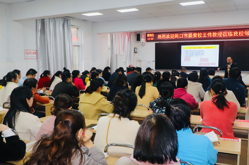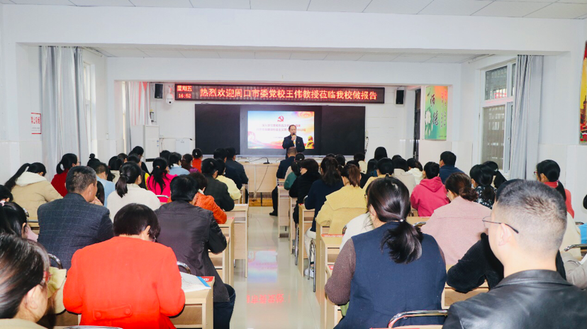 宣講會(huì)上,市委黨校宣講團(tuán)講師王偉以“深入學(xué)習(xí)貫徹市五次黨代會(huì)精神、開啟全面建設(shè)社會(huì)主義現(xiàn)代化周口新征程”為主題,從充分認(rèn)識(shí)市五次黨代會(huì)的重大意義、準(zhǔn)確把握市五次黨代會(huì)的精神要義、全面落實(shí)市五次黨代會(huì)的目標(biāo)任務(wù)三方面,詳盡解讀了市五次黨代會(huì)主旨報(bào)告的精神實(shí)質(zhì)和豐富內(nèi)涵。整場報(bào)告脈絡(luò)清晰、論述深刻、內(nèi)容豐富,既有深入淺出的理論闡述,又有結(jié)合我市發(fā)展的實(shí)例分析,更有教育實(shí)踐層面的對(duì)策思考,為該校教職工深入、完整、系統(tǒng)地領(lǐng)會(huì)市五次黨代會(huì)精神,有力推進(jìn)貫徹落實(shí)黨代會(huì)精神提供了一把“金鑰匙”。