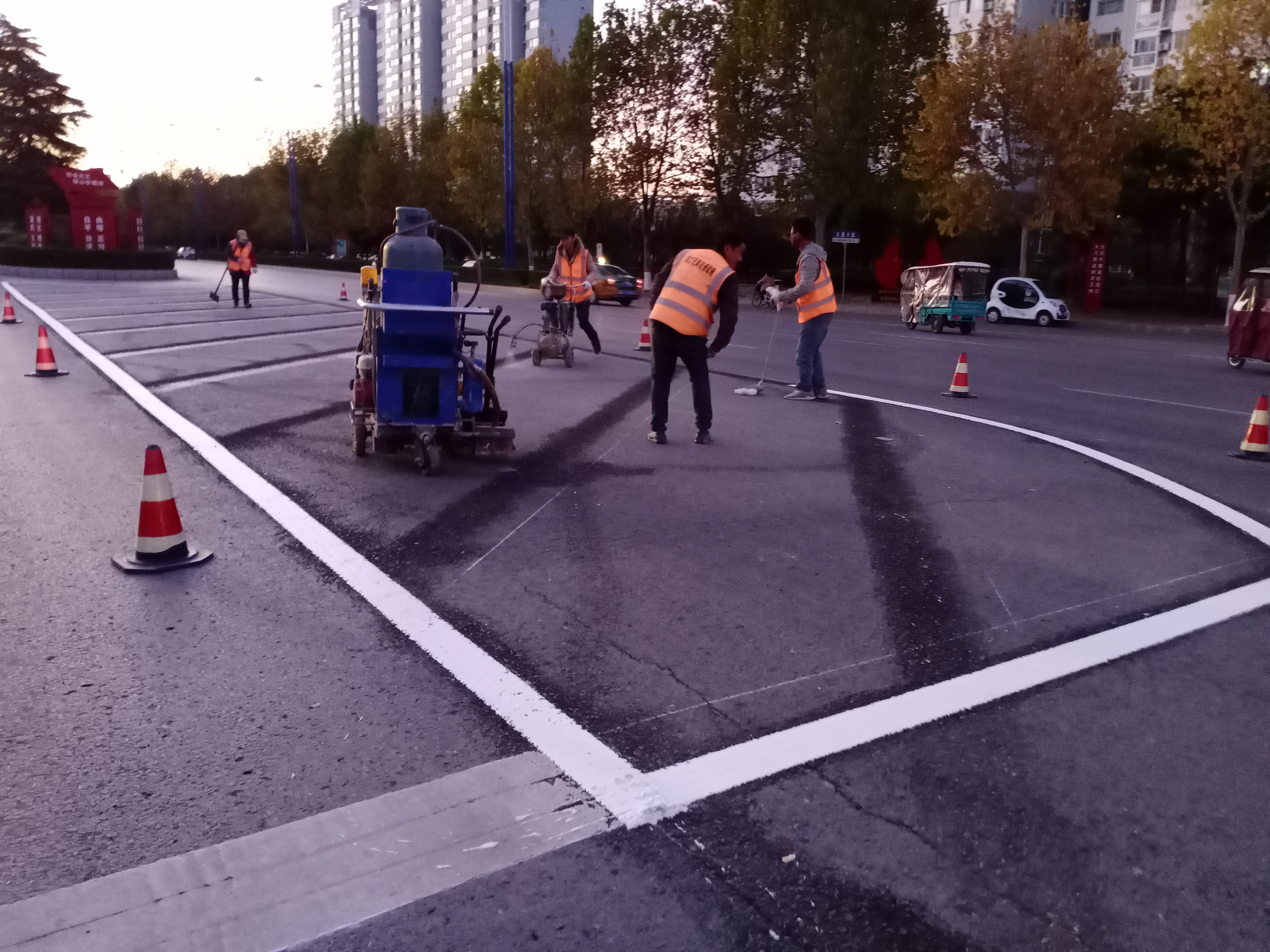 11月9日17時許,記者在周口市中心城區(qū)文昌大道與中原路交叉口看到,施工人員正在對交叉路口上的交通標(biāo)志線進(jìn)行施劃,規(guī)范車輛和行人通行秩序,保證交通安全暢通有序,方便群眾出行。③3記者 張洪濤 攝