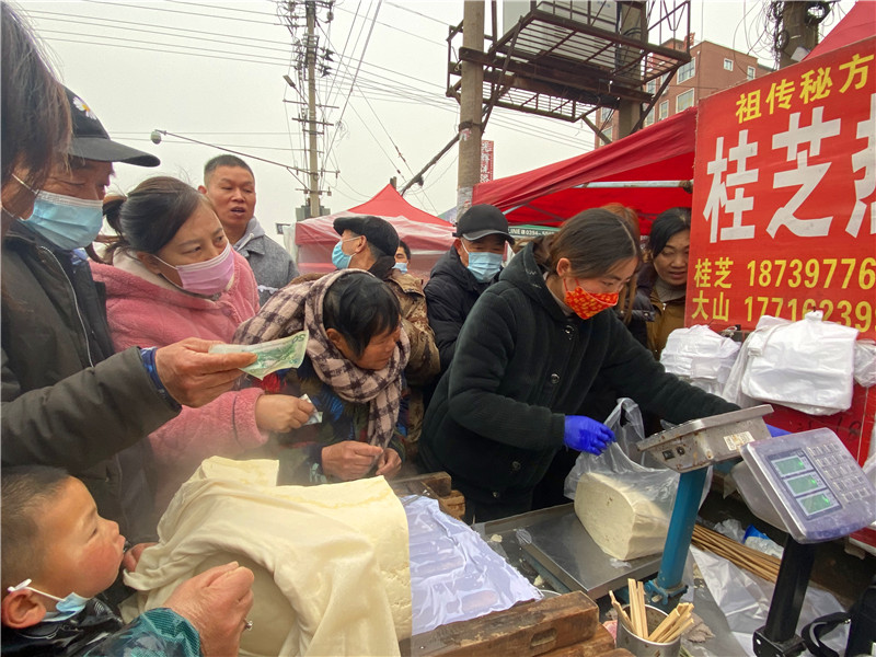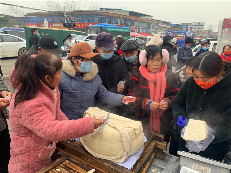 在固墻鎮(zhèn)的集市上,“桂枝熱豆腐”攤位前的顧客絡(luò)繹不絕?!敖o我來50塊錢的豆腐”“我要20斤,先給我切豆腐吧”“我要30斤,多少錢”……人群將豆腐攤里三層外三層圍了起來,從人群外朝里看看不見豆腐,只看到豆腐攤里冒出來的團(tuán)團(tuán)熱氣?!暗攘税雮€小時了,剛才那一盒豆腐沒輪到我就賣完了,這才搶到手?!备浇拇迕駰畲鬆斈弥鴦傎I的豆腐高興地說?!拔覐穆挂貋淼模憬阍诶锩鏀D著買豆腐,我在這兒等她呢?!?歲的張家瑞說,她每年放寒假都會和家人一起到固墻來探親,過年的時候逛逛集市,順便買些豆腐帶回鹿邑。