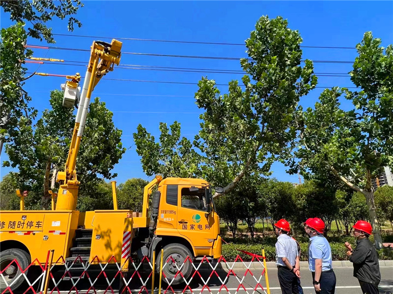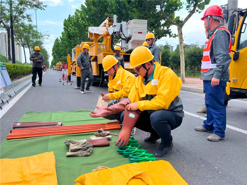 當日下午,在中心城區(qū)武盛大道南段,國網(wǎng)周口供電公司工作人員嚴格按照標準化作業(yè)流程,穿戴絕緣服、絕緣安全帽、絕緣手套等防護安全工器具,在黃色絕緣斗臂車“長臂”的助力下于高空中有序進行施工。