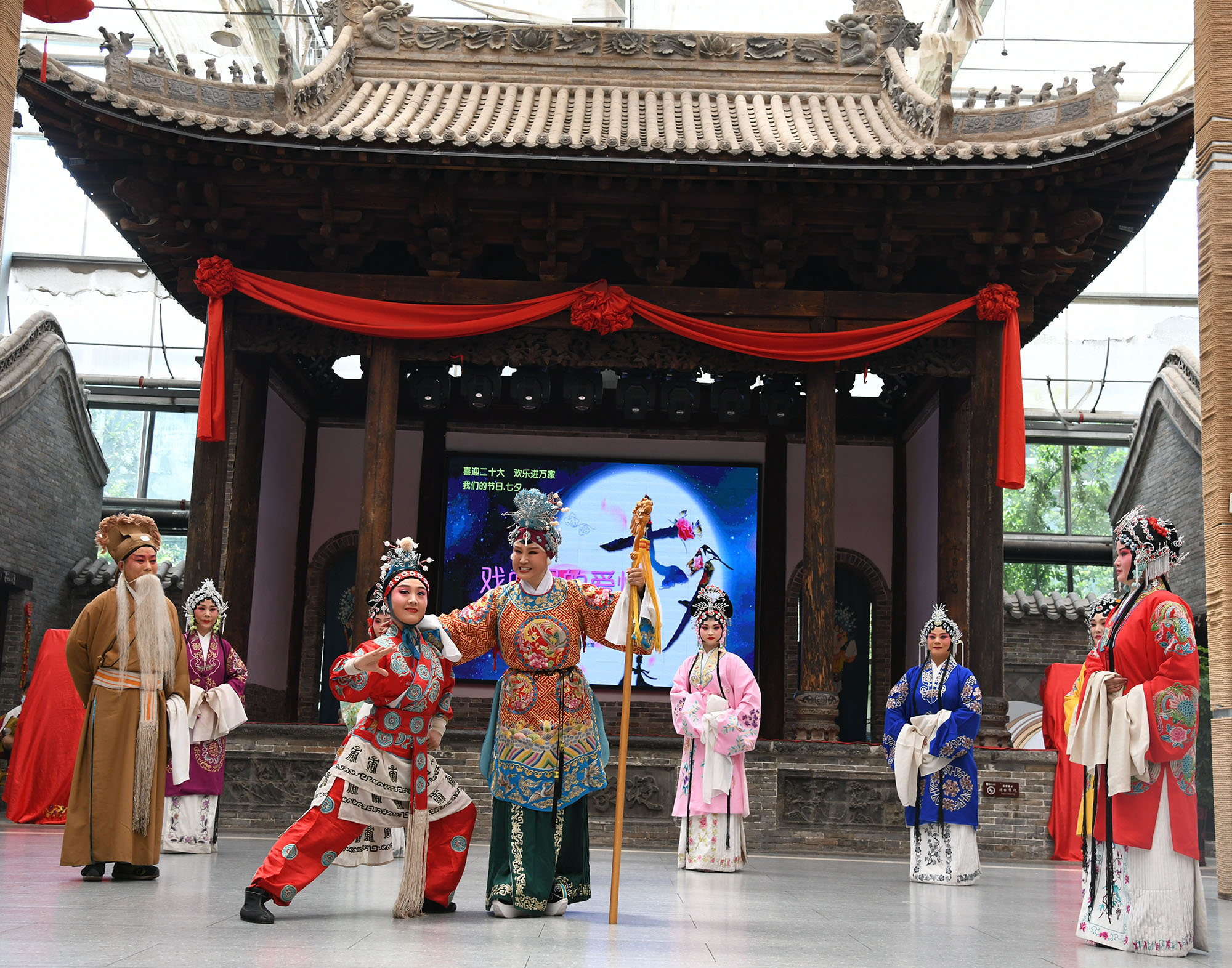 • ?8月3日上午,市豫劇團(tuán)團(tuán)長、戲劇藝術(shù)家肖秀蓮帶領(lǐng)演員們在建業(yè)大食堂演出《五世請纓》中的《一家人歡天喜地》一折。