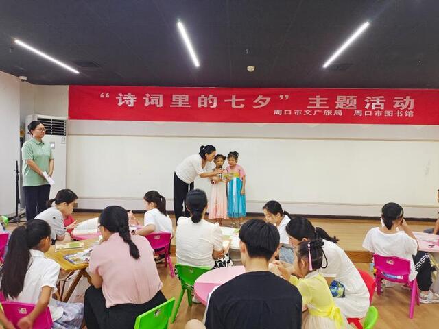 • 七夕今宵看碧霄,牽??椗珊訕?。8月20日,一場別開生面的“詩詞里的七夕”主題活動在周口市圖書館青少年活動中心舉行。書香覓詩詞、同心題詩詞、粘土畫詩詞……參與的孩子在詩情畫意中感受到中華傳統(tǒng)節(jié)日的內(nèi)涵。
