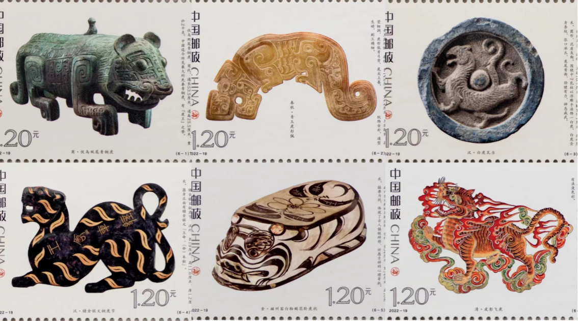 9月5日,由中國(guó)郵政特別制作的《虎文物》特種郵票正式發(fā)行。此套郵票共有6枚,每枚上都印有一件珍貴的虎文物。郵票圖案名稱分別為“商·伏鳥雙尾青銅虎”“春秋·青玉虎形佩”“漢·白虎瓦當(dāng)”“漢·錯(cuò)金銘文銅虎節(jié)”“金·磁州窯白釉褐花臥虎枕”“清·皮影飛虎”。其中第五枚郵票圖案中的“金·磁州窯白釉褐花臥虎枕”就是來自周口市博物館的珍貴文物,該郵票運(yùn)用光油和浮雕擊凸工藝,塑造了虎安詳、可愛的形象。