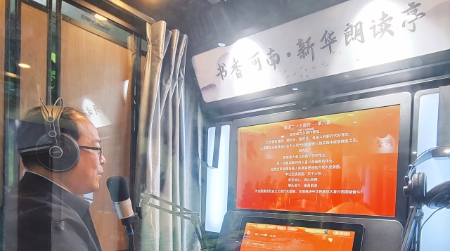 • 11月3日,在位于項(xiàng)城市商城路與西大街交叉口的新華書(shū)店朗讀亭內(nèi),誦讀愛(ài)好者年秋燕正在選讀黨的二十大報(bào)告原文,其深情且鏗鏘有力的誦讀聲令人如癡如醉。