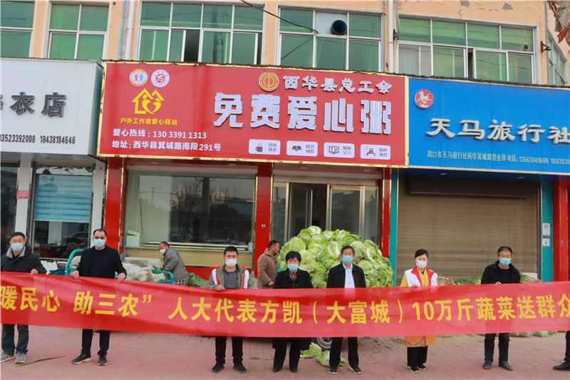 近日,方凱了解到西華縣黃橋鄉(xiāng)菜農(nóng)蔬菜滯銷的問題,便立即到現(xiàn)場察看,當(dāng)即決定幫助菜農(nóng)解決蔬菜滯銷難題,購買10萬斤蔬菜,并將這些蔬菜捐贈給縣人民醫(yī)院、中醫(yī)院、敬老院等單位。