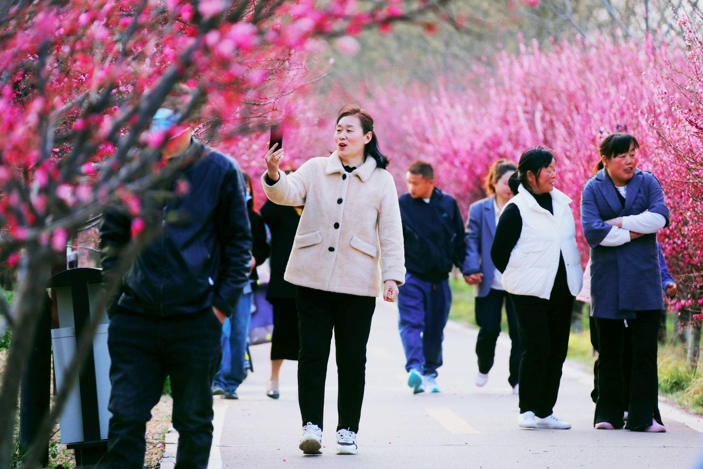 連日來(lái),長(zhǎng)達(dá)十里的桃花長(zhǎng)廊,每天吸引著眾多市民前來(lái)踏青賞花、拍照留念。人們?cè)谫p花的同時(shí),陶冶了心情,鍛煉了身體,收獲了愉悅。①2