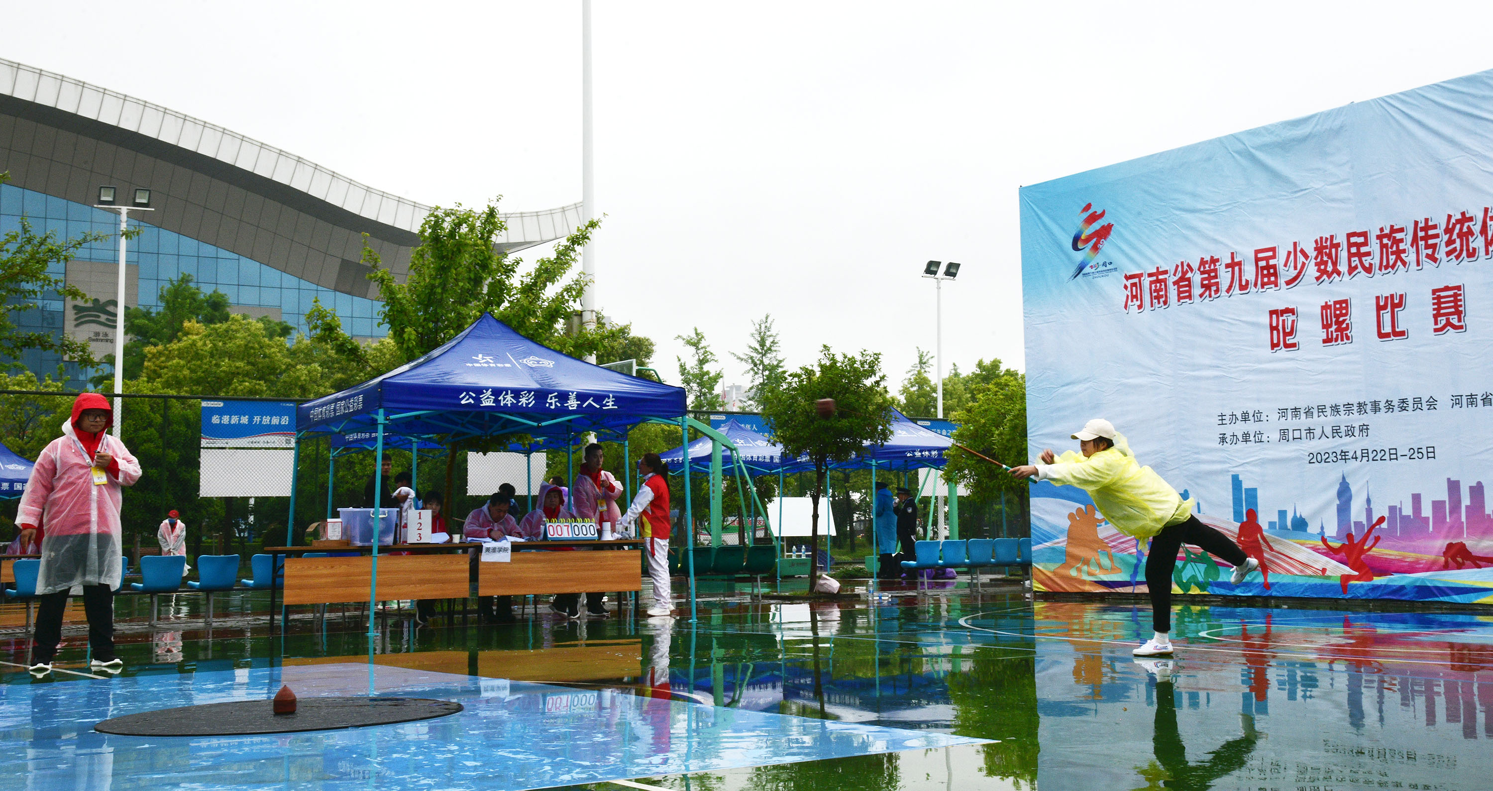 4月23日上午,河南省第九屆少數(shù)民族傳統(tǒng)體育運(yùn)動(dòng)會(huì)開賽。圖為在市體育中心進(jìn)行的板鞋競(jìng)速和陀螺比賽。記者 梁照曾 攝