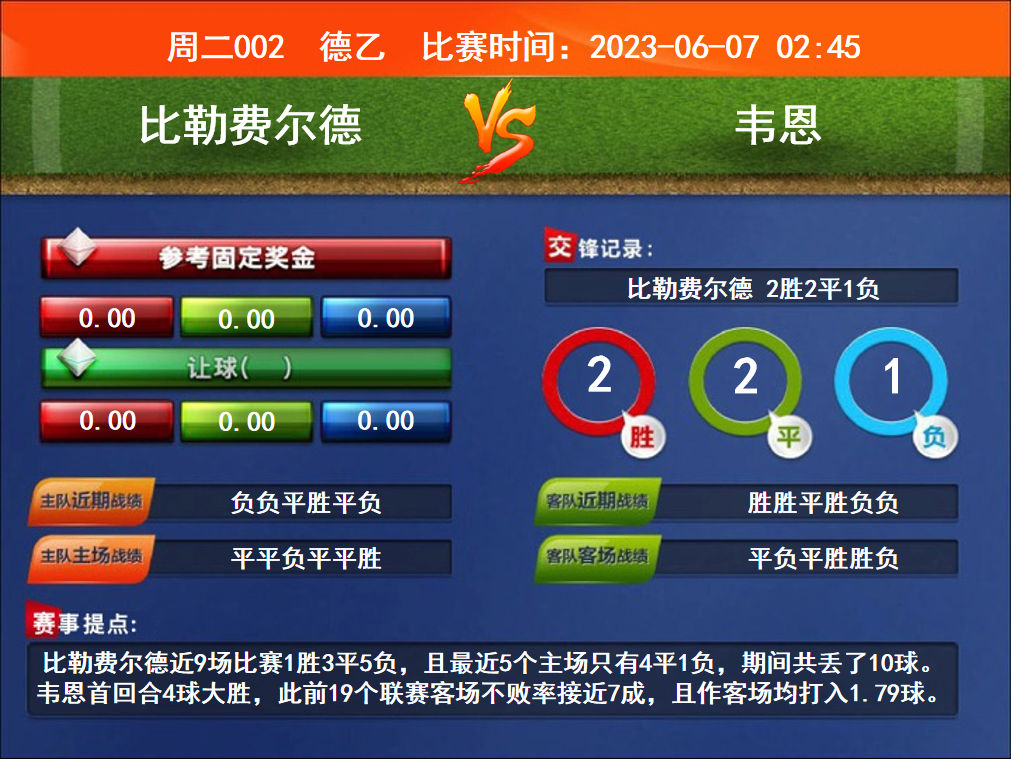 賽事提點:比勒費爾德近9場比賽1勝3平5負,且最近5個主場只有4平1負,期間共丟了10球。韋恩首回合4球大勝,此前19個聯(lián)賽客場不敗率接近7成,且作客場均打入1.79球。