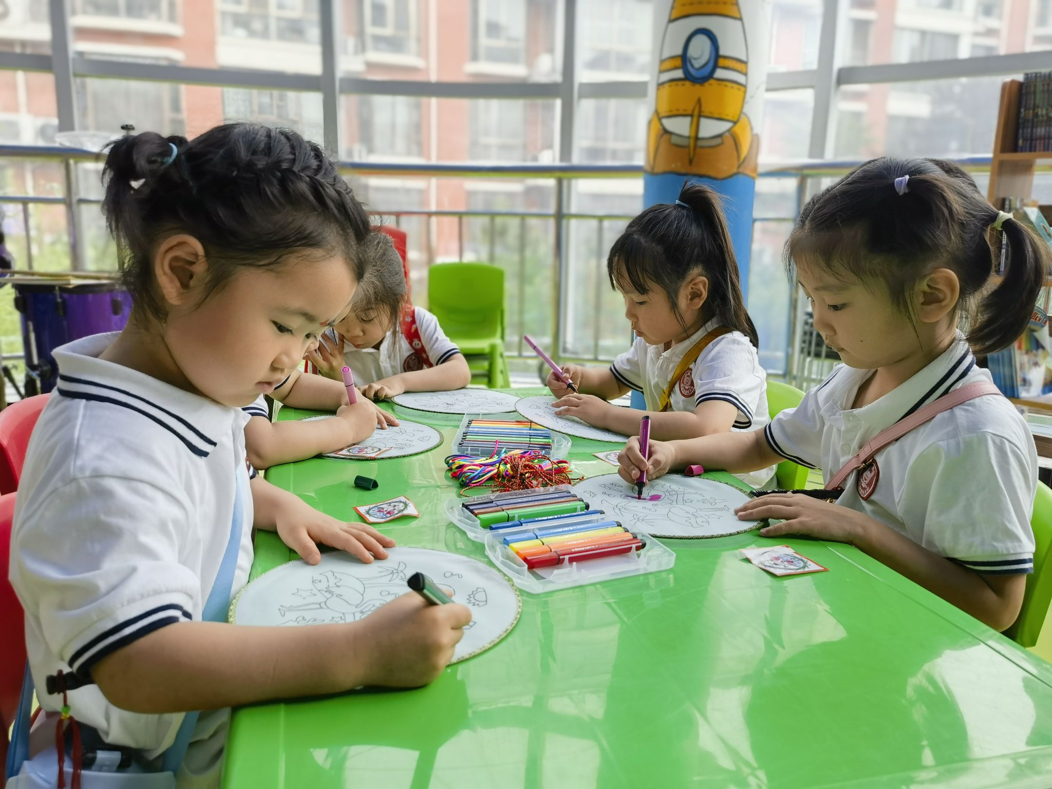 編織五彩繩是端午節(jié)的習(xí)俗之一,有祈福納吉的美好寓意;團(tuán)扇是古代扇文化的代表,有著深厚的文化底蘊(yùn)……在當(dāng)天的活動(dòng)中,中原社區(qū)還邀請(qǐng)部分小朋友參與畫團(tuán)扇、編彩繩活動(dòng)。道德文明使者給小朋友們分發(fā)了空白團(tuán)扇、顏料等,耐心地講解繪畫方法及團(tuán)扇的歷史。聽著講解,小朋友們一筆一畫在潔白的扇面上描繪出一個(gè)個(gè)色彩鮮艷的形象,一把把素面團(tuán)扇被賦予了栩栩如生的圖景,讓大家感受到了傳統(tǒng)文化的魅力。隨后,道德文明使者拿起五彩絲線,手把手教小朋友們編彩繩,讓他們感受手工藝的樂趣?!敖裉斓幕顒?dòng)非常有意義,我喜歡編彩繩,也喜歡畫畫。”小朋友樂樂(化名)說。