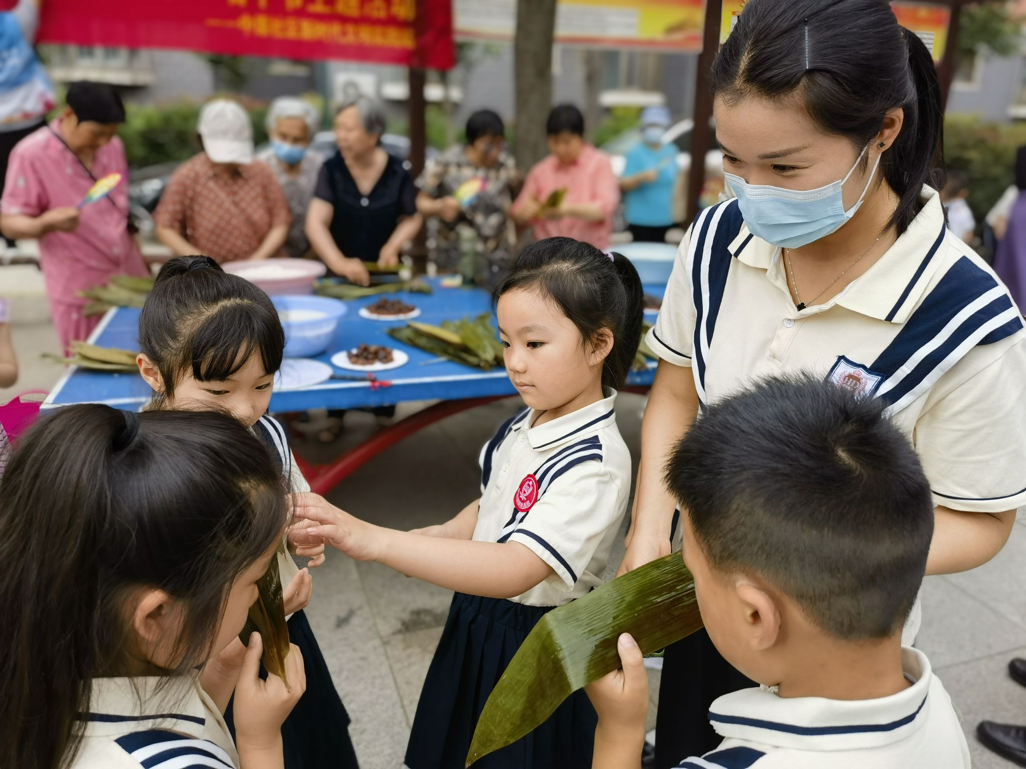 當(dāng)日8時(shí)許,社區(qū)工作人員,道德文明使者,市委辦公室、市委組織部、市檔案館機(jī)關(guān)黨員干部,金銳物業(yè)工作人員將糯米、紅棗、粽葉等包粽子必備材料準(zhǔn)備齊全,轄區(qū)居民不約而同來到現(xiàn)場(chǎng)“一展身手”。粽子雖小,門道不少,一折葉、二盛料、三壓實(shí)、四包嚴(yán)、五扎繩……看似簡(jiǎn)單,但要做出餡料十足、外觀漂亮的粽子還是需要一番功夫的。有的居民沒有經(jīng)驗(yàn),不是繩子松了,就是糯米撒了,包粽子巧手楊凱阿姨耐心地指導(dǎo)“新手”,捋粽葉、做漏斗狀、填糯米、壓緊實(shí)、封口扎捆,一張張翠綠的粽葉在大家手中翩翩起舞,三角形、枕頭形、長條形的精致粽子逐漸成型。“包粽子就像做人做事一樣,要清白分明,有棱有角,分寸有度,扎實(shí)穩(wěn)固?!睏畎⒁痰脑捵屧趫?chǎng)居民紛紛鼓掌點(diǎn)贊。