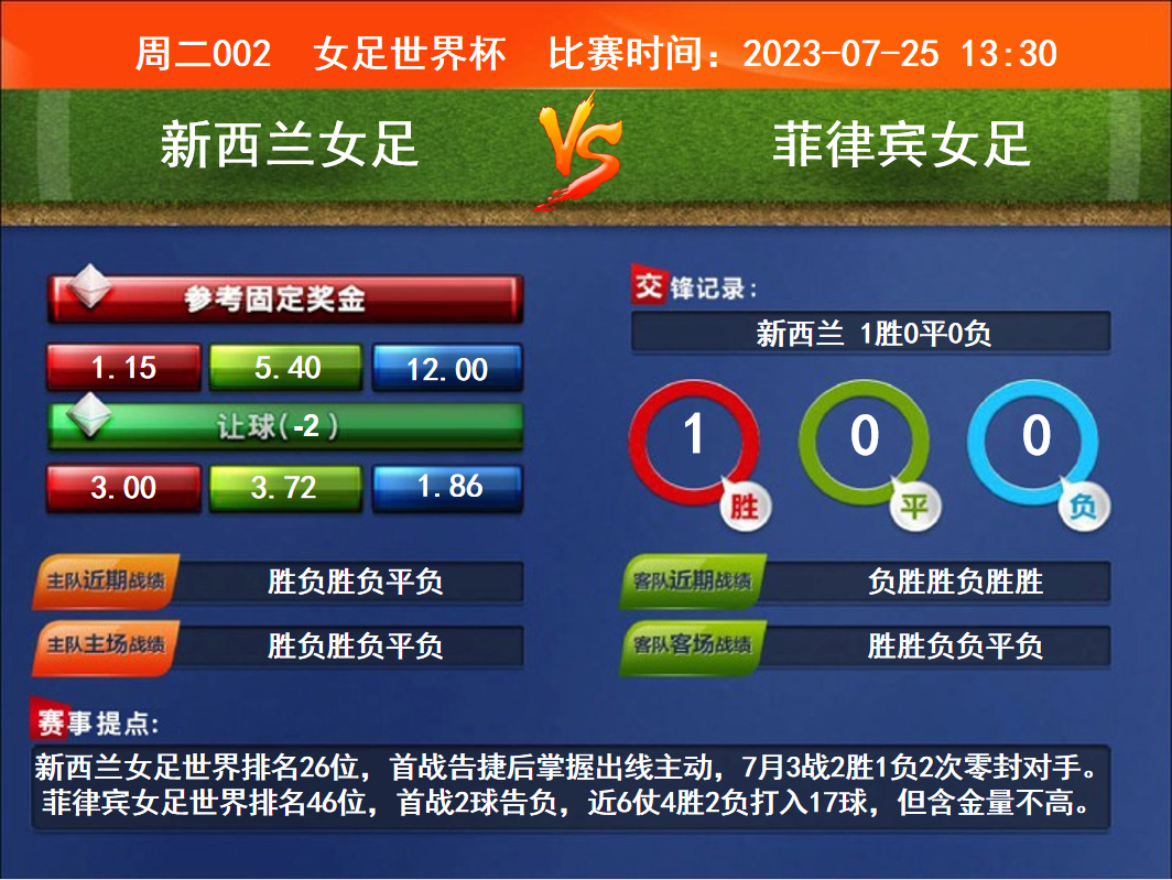 比賽時(shí)間:2023-07-25 13:30賽事提點(diǎn):新西蘭女足世界排名26位,首戰(zhàn)告捷后掌握出線主動(dòng),7月3戰(zhàn)2勝1負(fù)2次零封對(duì)手。菲律賓女足世界排名46位,首戰(zhàn)2球告負(fù),近6仗4勝2負(fù)打入17球,但含金量不高。