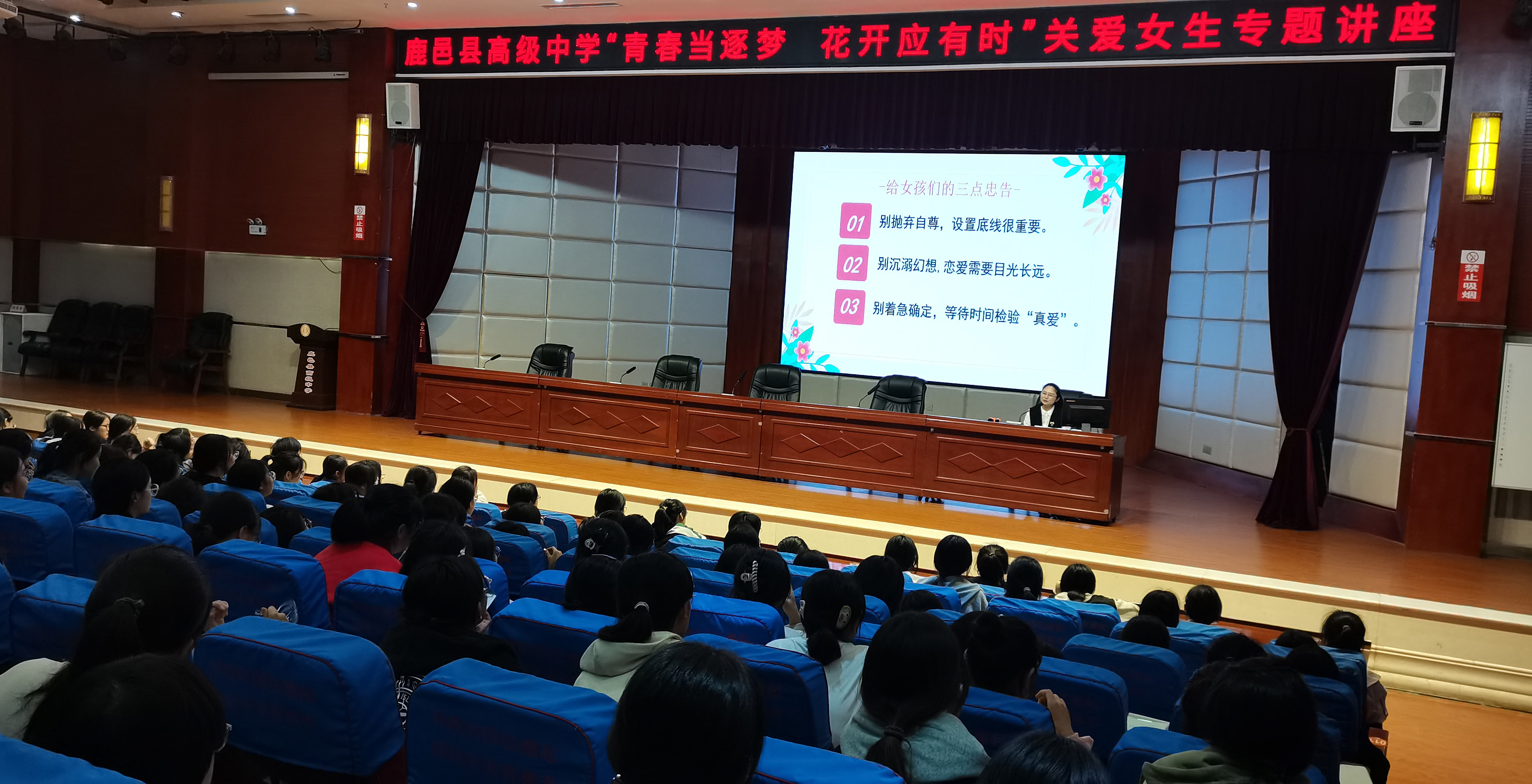 9月26日、27日晚,鹿邑縣高級中學(xué)舉行兩場以“青春當(dāng)逐夢,花開應(yīng)有時”為主題的關(guān)愛女生專題講座。講座進(jìn)一步推動學(xué)校心理健康教育工作,幫助學(xué)生提高心理健康水平,引導(dǎo)女生正確認(rèn)識青春期心理及生理上的變化,樹立積極向上的人生觀。此次專題講座由學(xué)校婦委會主任夏寧主持。