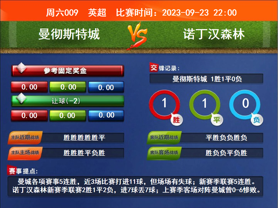比賽時間:2023-09-23 22:00賽事提點:曼城各項賽事5連勝,近3場比賽打進11球,但場場有失球;新賽季聯(lián)賽5連勝。諾丁漢森林新賽季聯(lián)賽2勝1平2負,進7球丟7球;上賽季客場對陣曼城曾0-6慘敗。