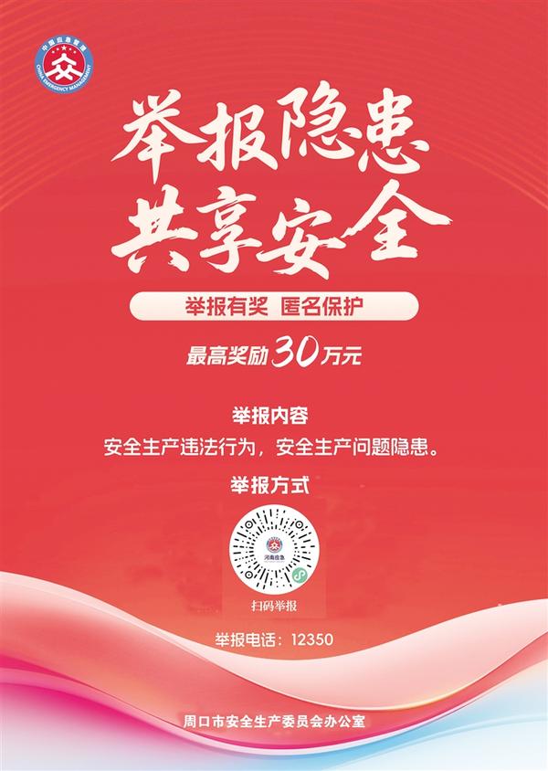• 周口市安全生產(chǎn)委員會辦公室以舉報電話、掃碼舉報等方式,受理群眾舉報安全生產(chǎn)非法違法行為線索。一經(jīng)查實,我們將依據(jù)《河南省安全生產(chǎn)領(lǐng)域舉報獎勵實施辦法》相關(guān)規(guī)定,對舉報人予以獎勵,最高獎勵金額30萬元。我們將對舉報人個人信息進行嚴(yán)格保密,依法保護舉報人的合法權(quán)益。
