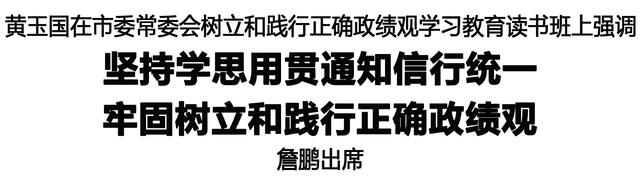 黃玉國(guó)指出,黨的十八大以來(lái),習(xí)近平總書(shū)記圍繞樹(shù)立和踐行正確政績(jī)觀發(fā)表的一系列重要論述,立意高遠(yuǎn)、內(nèi)涵豐富、思想深刻,為開(kāi)展樹(shù)立和踐行正確政績(jī)觀學(xué)習(xí)教育指明了方向、提供了重要遵循。全市廣大黨員干部要帶著信仰學(xué)、帶著責(zé)任悟,深刻把握“政績(jī)?yōu)檎l(shuí)而樹(shù)”,堅(jiān)守為民造福的根本立場(chǎng);深刻把握“樹(shù)什么樣的政績(jī)”,創(chuàng)造經(jīng)得起檢驗(yàn)的過(guò)硬實(shí)績(jī);深刻把握“靠什么樹(shù)政績(jī)”,錘煉真抓實(shí)干的務(wù)實(shí)作風(fēng),做到學(xué)思用貫通、知信行統(tǒng)一。