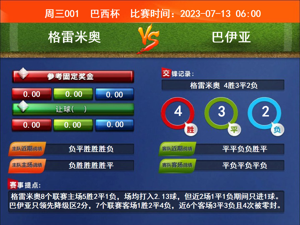 周三競彩足球強(qiáng)檔:格雷米奧勝率不俗 圣何塞5戰(zhàn)不勝