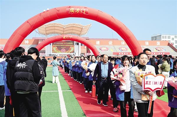 2月27日上午,淮陽(yáng)中學(xué)運(yùn)動(dòng)場(chǎng)上洋溢著青春的氣息,一支支朝氣蓬勃的隊(duì)伍走過(guò)成人門。
