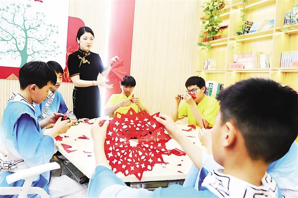 “五一”假期,周口市非物質文化遺產剪紙項目代表性傳承人劉秀華(左三)在淮陽伏羲公園的石榴學堂內,為學生講授剪紙知識,既提高了學生的剪紙水平及欣賞能力,又豐富了他們的假日文化生活。