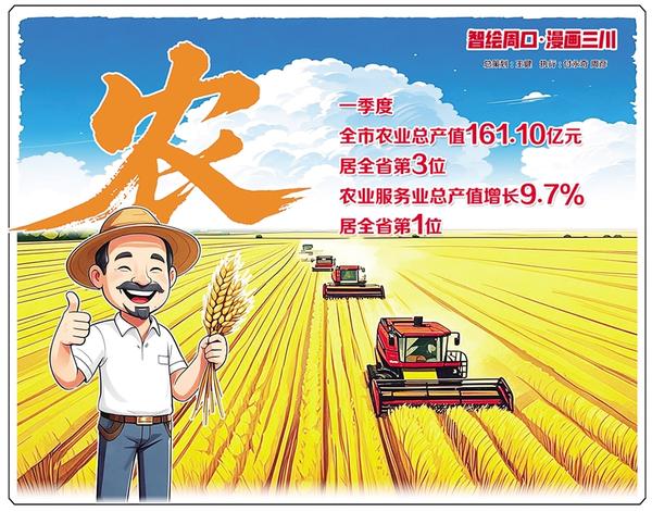 今年以來,我市農業(yè)發(fā)展穩(wěn)中有進,一季度,全市農業(yè)總產值161.10億元,同比增長3.3%,高于全省0.6個百分點,居全省第3位;第一產業(yè)用電量2.3億千瓦時,同比增長24.87%;農業(yè)服務業(yè)總產值增長9.7%,居全省第一位。
