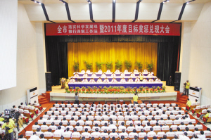 圖為項城市落實科學發(fā)展觀推行四制工作法暨2011年度目標獎懲兌現(xiàn)大會會場。楊光林 張康 攝