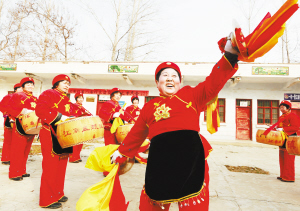 ④扶溝縣江村鎮(zhèn)江南盤鼓隊(duì)正在村室緊張排演節(jié)目。春節(jié)期間,她們走上街頭,為當(dāng)?shù)厝罕娝蜕衔幕蟛汀?nbsp; (記者 王 映 攝)