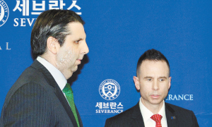 3月10日,在韓國首爾,美國駐韓國大使馬克·利珀特(左)在出院前出席記者會。當(dāng)?shù)貢r間5日上午,利珀特在出席首爾世宗文化會館舉行的活動時,被一名韓國男子用刀劃傷,襲擊嫌疑人被當(dāng)場抓住。