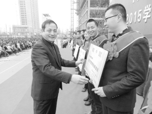 3月8日上午,淮陽一高萬余名師生在學(xué)校操場隆重舉行新學(xué)期表彰大會。大會回顧了2014~2015學(xué)年第一學(xué)期的各項工作,對感動校園學(xué)生、優(yōu)秀班主任、優(yōu)秀員工、優(yōu)質(zhì)課教師等24個項目近500人次進行了表彰?;搓柨h有關(guān)領(lǐng)導(dǎo)及淮陽一高全體師生參加了本次表彰大會。圖為王業(yè)生校長為獲獎人員頒發(fā)獎狀。(豆紀鋒 攝)