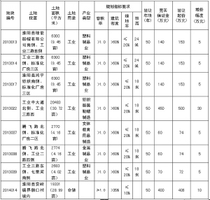 備注:1.2013013、2013014、2013017、2013022、2013037、2013038、2013039宗地位于產(chǎn)業(yè)集聚區(qū)內(nèi),屬兩層以上標(biāo)準(zhǔn)化廠房建設(shè)用地,投資強(qiáng)度≥3750萬(wàn)元/公頃。地上有部分違法建筑物,經(jīng)政府辦、發(fā)改委、財(cái)政局、監(jiān)察局、法制辦、住建局、審計(jì)局、房產(chǎn)辦、規(guī)劃辦、城市綜合執(zhí)法局和縣產(chǎn)業(yè)集聚區(qū)管委會(huì)集體研究,地上建筑不再作價(jià)與土地捆綁出讓?zhuān)赏恋馗?jìng)得人無(wú)償處置地上建筑物。土地出讓合同簽訂后,8個(gè)月內(nèi)必須開(kāi)工建設(shè),工期24個(gè)月,土地成交價(jià)款需在土地出讓合同簽訂后60日內(nèi)繳清,交地時(shí)間在3個(gè)月內(nèi)。