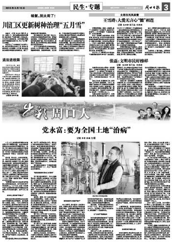 “近年來(lái)土壤酸化板結(jié)速度加快,所有土地遭受不同程度的農(nóng)資次生災(zāi)害。建議各級(jí)黨委和政府及有關(guān)部門應(yīng)盡早重視土地污染治理工作,牽頭組織相關(guān)部門,爭(zhēng)取盡快在全市范圍內(nèi)宣傳、推廣和應(yīng)用土地污染治理技術(shù),逐步向全國(guó)受污染的土地開戰(zhàn),為子孫留下更多的凈土?!秉h永富說(shuō),這是他的夢(mèng)想。