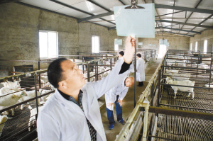 孫振偉原是當?shù)刂那嗄昶髽I(yè)家,2008年初被西關(guān)村居民高票選舉為村黨支部書記,憑著對家鄉(xiāng)的強烈責任感和保護槐山羊特色品種的使命感,孫振偉帶領(lǐng)西關(guān)村立足本村作為槐山羊傳統(tǒng)養(yǎng)殖區(qū)的優(yōu)勢,于2010年成立沈丘縣槐山羊養(yǎng)殖發(fā)展有限公司,在省畜牧展交易會上,與鄭州鄭源公司合作,共同簽約了投資6000萬元建設(shè)槐山羊原種保護、繁育、深加工項目。同時與華中農(nóng)大建立技術(shù)合作關(guān)系,投資800萬元建成“槐山羊原種保護和繁育中心”,規(guī)劃設(shè)計了化驗室、消毒室、提純復壯室、品種基因室等配套規(guī)范設(shè)施,不僅為國家級優(yōu)良品種槐山羊的保種提純工作提供了科研平臺和寶貴數(shù)據(jù)庫,“槐山羊提純復壯良種繁育技術(shù)研究與應用”成果還獲得2013年度周口市科技進步一等獎。經(jīng)過提純復壯,目前中心存欄特征明顯的槐山羊母羊860只、種公羊36只,在此基礎(chǔ)上,計劃建成占地100畝的槐山羊養(yǎng)殖小區(qū),槐山羊板皮、肉制品等深加工項目都已經(jīng)開始實施。 “這些是經(jīng)過第五輪提純復壯繁育的槐山羊,目前可以說是最純種的槐山羊了?!睂O振偉指著一批剛出生的小羊向我們介紹。