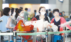 韓國(guó)又確診中東呼吸綜合征患者 5月30日,在韓國(guó)仁川國(guó)際機(jī)場(chǎng),佩戴口罩的乘客排隊(duì)等候辦理登機(jī)手續(xù)。韓國(guó)保健福祉部30日例行通報(bào)說(shuō),當(dāng)日新確診了1例中東呼吸綜合征患者。至此,韓國(guó)國(guó)內(nèi)確診的患者已增至12人,另有一名韓國(guó)患者在中國(guó)被確診。新華社發(fā)