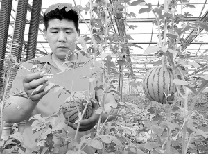扶溝縣豫星農業(yè)發(fā)展有限公司種植的“迷你彩虹西瓜”,以個小、皮薄、甜度高暢銷省內外,畝均收入達3萬元。圖為員工正在為“彩虹西瓜”整枝打杈。(谷志方 攝)