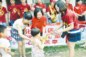 6月19日,端午節(jié)臨近之際,“美膚寶”攜手沈丘縣李玲化妝品店,來到沈丘縣豐產(chǎn)河小學(xué)開展“美膚寶陽光計劃”公益活動,共同為200多名留守兒童捐贈學(xué)習(xí)用品。圖為工作人員為留守兒童發(fā)放學(xué)習(xí)用品。(記者 韋偉 通訊員 王祥宇 柳珂)