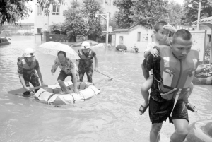 7月14日,四川省瀘州市的消防官兵在龍馬潭區(qū)救援受災(zāi)群眾。當(dāng)日,四川省瀘州市遭暴雨襲擊,部分路段內(nèi)澇嚴(yán)重,交通中斷。據(jù)瀘州市氣象局統(tǒng)計(jì),截至12時,該市最大降雨量超過200毫米。 新華社發(fā)